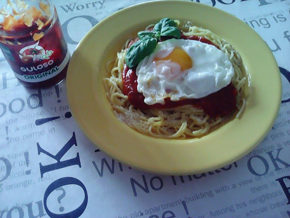 Escorra a massa, coloque num prato, coloque o molho sobre a massa e por fim o ovo para acabar.